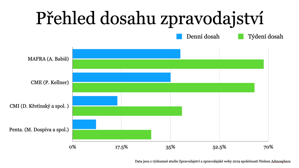 Skoro 70 % dospělých obyvatel České republiky sledujících zprávy se v loňském roce alespoň jednou týdně setkalo se zpravodajstvím médií ovládaných premiérem Andrejem Babišem. Podobný zásah mají i zpravodajské kanály, které dnes patří Petru Kellnerovi. Také zpravodajský zásah skupiny Daniela Křetínského a podnikatelů Penty je obrovský.